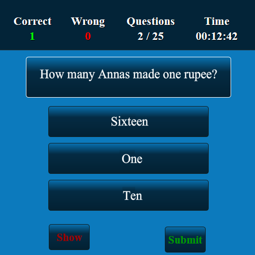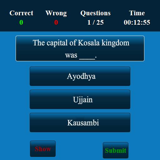 This Ancient Indian History app has been developed for testing your skills of Ancient Indian History. This app has more than 10,000 multiple choice questions and answers. This Ancient Indian History quiz app suits for all lower, intermediate and higher levels. The questions at all levels will be displayed randomly. The user can improve Ancient Indian History knowledge and user can score well in high school, college and competitive level examinations. This is a free version and you can be used in both offline and online.