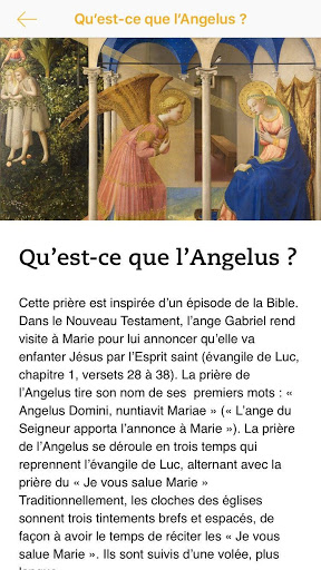 L’Angelus est une prière de dévotion à Marie, récitée traditionnellement le matin, le midi et le soir, au son des cloches d’une église. L’Angelus s’inspire du récit évangélique de l’annonciation à Marie.