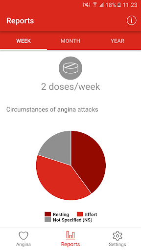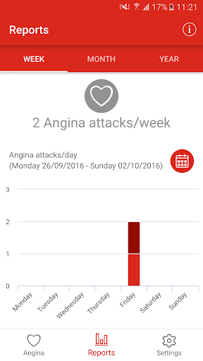 La fonction de rapport de l'application permettra aux médecins de suivre l'évolution des attaques d'angine de leurs patients au fil du temps. À cette fin, Anginacontrol affiche les données de la semaine, du mois ou de l'année, dans les graphiques indiquant: • Le nombre total d'attaques d'angandes par jour dans des rapports hebdomadaires et par semaine dans des rapports mensuels et annuels