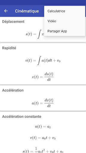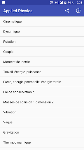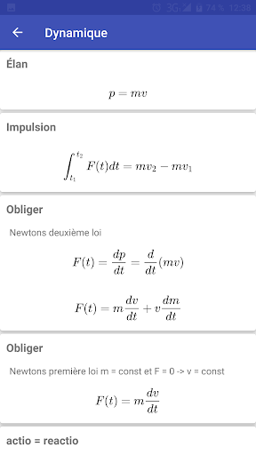 Des sujets tels que la cinématique, la dynamique, la vibration et la rotation pour n'en nommer que quelques-uns. Vous pouvez également rechercher des constantes physiques et des unités. Prend en charge 5 langues principales telles que l'anglais, l'allemand, le français, l'espagnol et le portugais.