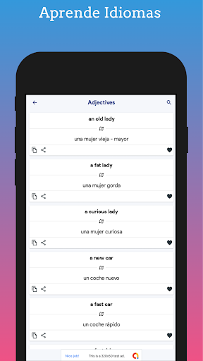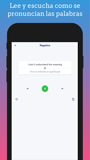 Avec cette application, vous pouvez apprendre avec des cours d'anglais gratuits pour votre téléphone ou tablette de n'importe où dans le monde. L'application a un certain nombre de catégories de phrases en anglais avec leur prononciation audio afin que vous appreniez leur signification des mots en anglais augmente votre vocabulaire anglais, une application parfaite pour les débutants et les personnes qui veulent apprendre la langue anglaise facilement et gratuitement.