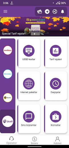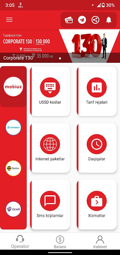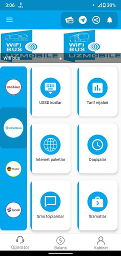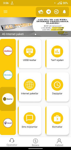 Endi Internet paketlar harid qilish, qo'shimcha xizmatlarni yoqish yoki o'chirish uchun USSD so'rovlarni jo'natishga hojat yo'q, shuningdek MobiUz, Uzmobile, Beeline, Ucell yangiliklaridan va aksiyalaridan birinchi bo'lib xabardor bo'lishingiz mumkin!