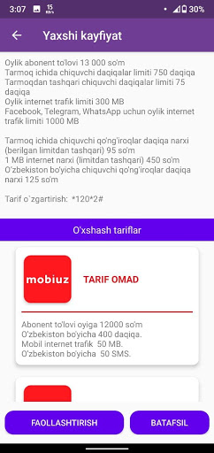 -tariflar haqida batafsil ma'lumotlar
