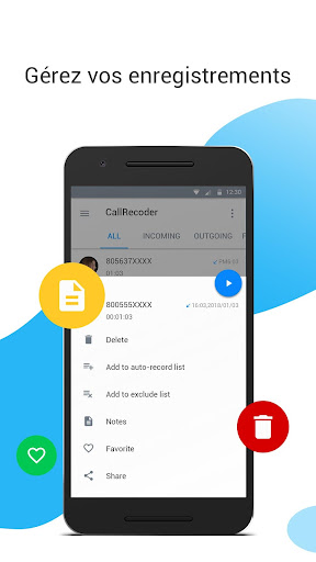 Vous pouvez enregistrer tous les appels entrants et sortants avec une haute qualité. La liste des fichiers enregistrés sera stockée et rationalisée pour vous. Vous pouvez gérer vos fichiers d'enregistrement, partager, lire, supprimer, renommer les appels et sauvegarder les enregistrements d'appels. Ne vous inquiétez jamais de perdre des enregistrements d'appels importants.