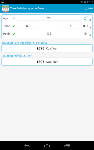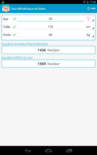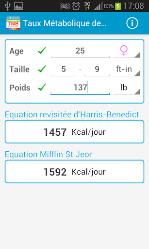 Ce taux est l'énergie, au repos, que vous dépensez par jour (kcal/jour). Dans cette application, nous calculons le taux métabolique de base à partir de deux formules. Ces deux formules s'appuient sur votre age, votre sexe, votre taille et votre poids.