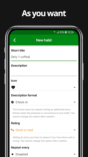 Chaque habitude peut être décrite avec quelques informations supplémentaires telles qu'une photo, un texte, un poids ou un numéro.Grâce à cela, l'application peut non seulement surveiller si votre habitude s'est produite, mais aussi, cela vous permet de mesurer vos progrès.Dans l'application, vous trouverez la fonction d'envoi de restes, grâce à laquelle vous n'oublierez pas de noter et d'analyser vos habitudes.