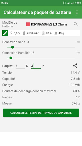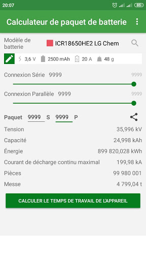 L'application vous permet de calculer les packs de batteries jusqu'à 9999S 9999P - presque 100 millions de batteries :) Ce qui vous permettra de calculer des packages pour les vélos électriques et des packages aussi volumineux que pour les voitures électriques (EV).