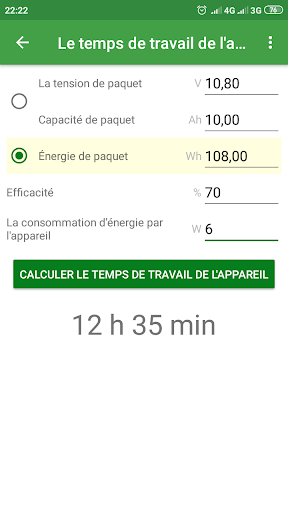 L'application facilite (pour les amateurs de bricolage et les professionnels de l'électronique ) le calcul des paramètres des batteries lithium-ion ou autres.