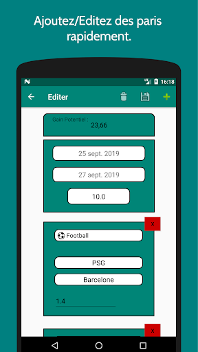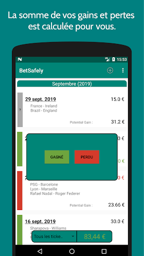 BetSafely vous permet de garder une trace de tous les paris sportifs que vous avez effectué. Elle vous permet de calculer et de sauvegarder vos gains et pertes. Cela vous permet de connaître facilement vos gains de la semaine, du mois, ou de l'année en cours. Le but étant de vous faire prendre conscience de l'argent mis en jeu, gagné et perdu.