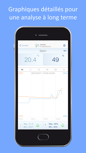 Très pratique : l'affichage de plusieurs pièces permet de gérer plusieurs thermo-hygromètres Beurer à la fois via l'application. Vous pouvez donc surveiller la qualité de l'air dans plusieurs pièces à la fois sur l'application. Vous pouvez représenter graphiquement les résultats de façon claire – il est possible de le faire sur plusieurs périodes. Il est également possible d'exporter vos données.
