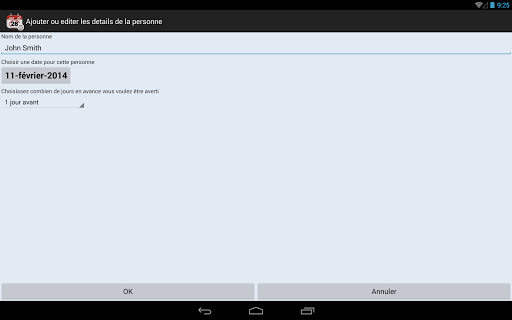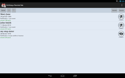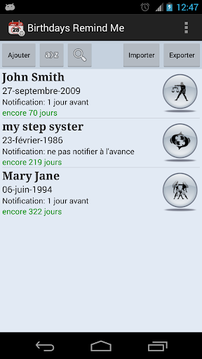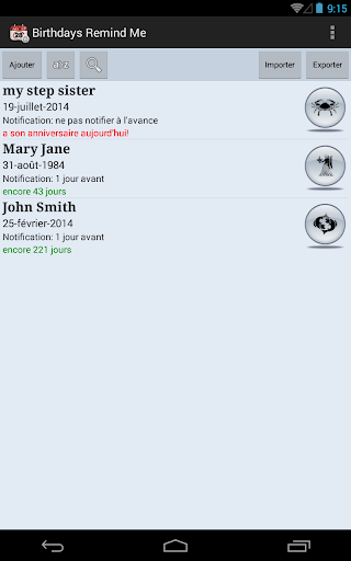 Cette application offre un moyen pratique de rappel des anniversaires prochains de vos amis, connaissances et autres personnes.