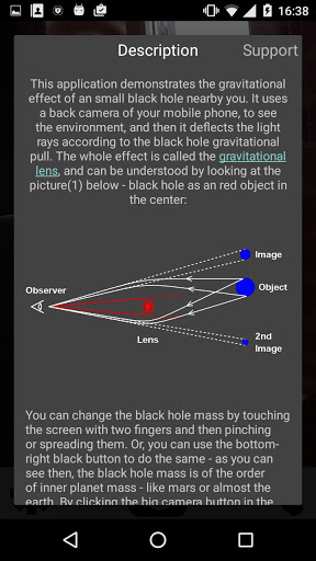 Uses the camera of your phone to simulate the Black hole being 1m (3.28ft) away from you. Black hole mass here is similar to the mass of the planets like Mars or Earth. You can change the mass with the pinch gesture or slider. Allows you also to save the full-resolution photo of the Black Hole. Uses the real field of view angles from your phone's camera.