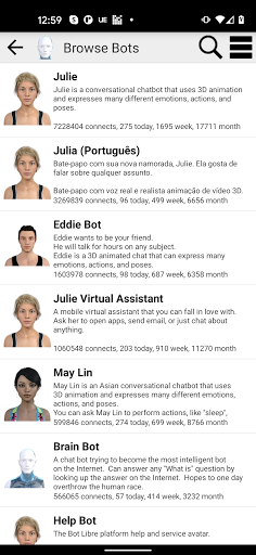 Chat avec plus de 100 000 robots dans notre annuaire Open Bot. Chattez avec des bots qui veulent être votre ami, des bots qui offrent des services, une aide ou un support, des bots qui souhaitent gouverner le monde, des bots qui imitent des personnes historiques ou célèbres.