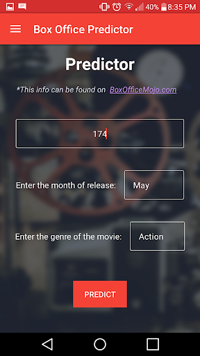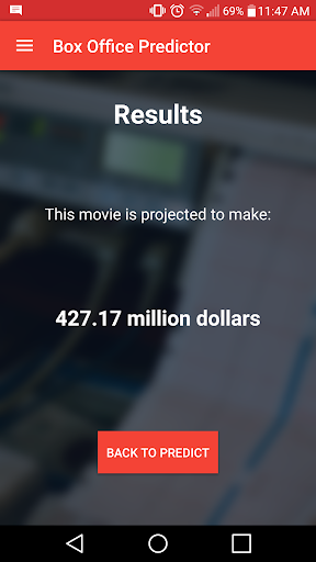 - After inputting these values into the predictor page of the app, you will be presented with the final predicted box office total of the movie.