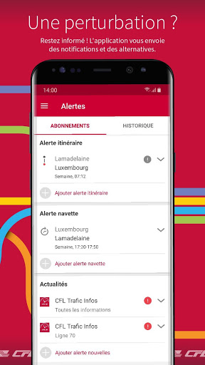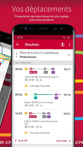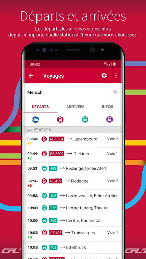 L’application CFL mobile est votre assistant pour la planification de vos trajets en transport public au Luxembourg et au-delà. Simplissime et ergonomique, cette application vous permet d’arriver rapidement à destination. Indiquez le départ et la destination, choisissez le créneau horaire et vous voilà prêt à partir ! Elle vous propose des trajets et des moyens de transports alternatifs. Les horaires et les informations en temps réel vous épauleront dans le choix de votre trajet en fonction de la situation du trafic du moment. Grâce à l’intégration d’une multitude de points d’intérêt et des adresses luxembourgeoises, l’application vous permet de voyager porte à porte dans le Luxembourg.