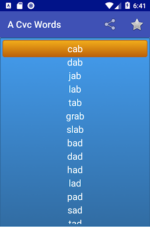 Cette application a des mots CVC (consonne consonne consonne) pour améliorer et aider les enfants à apprendre et à lire les mots anglais.Les mots CVC jouent une étape importante dans la pratique de la phonétique et l'apprentissage de la lecture.Les mots seront également prononcés par le haut-parleur pour permettre un apprentissage rapide et facile.Très utile pour les enfants préscolaires, maternels et pépinières.