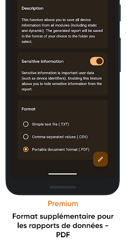 Recueillez toutes les informations de votre appareil et partagez-les en utilisant une méthode appropriée. Castro prend en charge les formats .TXT, .CSV et .PDF (Premium uniquement) et offre la possibilité de masquer des informations anonymes ou dynamiques.
