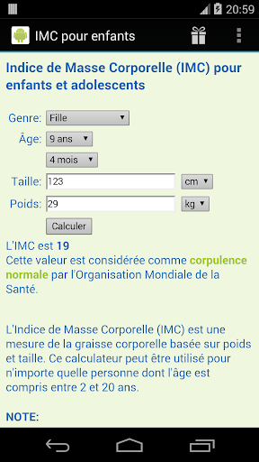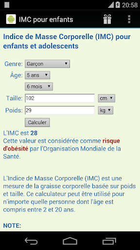 Notez que à mesure que les enfants grandissent, leur quantité de graisse corporelle change et ainsi leur IMC. C'est pourquoi que le calcul de l'IMC pour un enfant ou un adolescent doit tenir compte l'âge et le sexe. Consultez toujours avec votre médecin si vous êtes préoccupé par la croissance de votre enfant.
