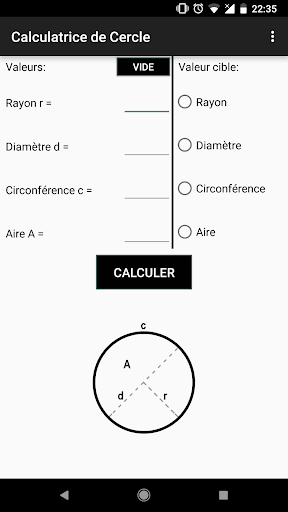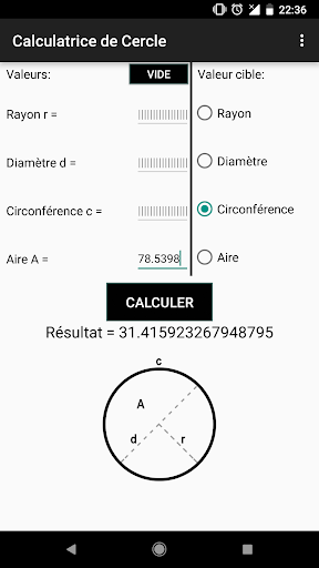 • Capable de calculer le rayon, le diamètre, la circonférence ou l'aire d'un cercle avec des valeurs connues valides.