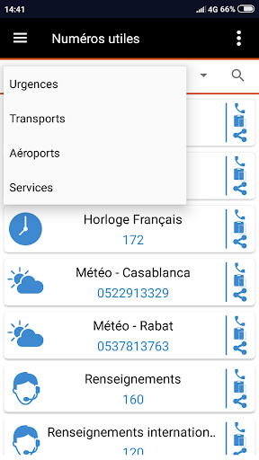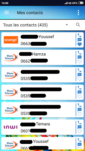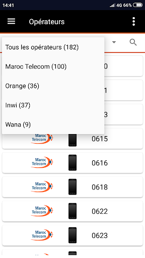 L'application inclut les indicatifs des téléphones Fixe et Mobile des 4 opérateurs marocains (Maroc Telecom - Orange - Inwi et Wana) et vous permet de faire le filtrage de vos contacts par opérateur.