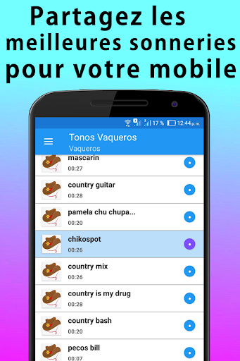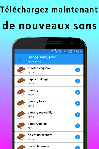 Profitez des meilleurs tonalités de cow-boy gratuites populaires, des tonalités de contact du Far West, des sonneries d'alarme, des sonneries de notification Cowboy Golden Years Old est l'application de sonneries gratuites où vous trouverez le meilleur des chansons country, des sonneries de musique romantico, des sonneries appel gratuit de sons en anglais écouter à tous les sons de chansons à la mode tonalités comme: bon moche mauvais, chikospot, country bash, ferme de campagne, country is my drug, country gingle, country rockabilly, country song, country mix, la souris de cow-boy, mascarin, n'était pas un cow-boy, pamela chu suce ..., cowboy rocker, pecos bill, cowboy rockanrolero, country dance, country guitar.