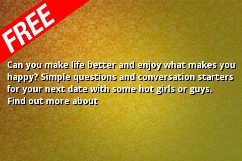 Can you make life better and enjoy what makes you happy? Simple questions and conversation starters for your next date with some hot girls or guys. find out more about your special girlfriend or boyfriend. They39;re simple yet engaging questions that if played right you may have her intrigued that you want to know so much about her and maybe she just might fall in love with you. girl, dating, date, romance, conversation, quotes, questions, quiz quizzes