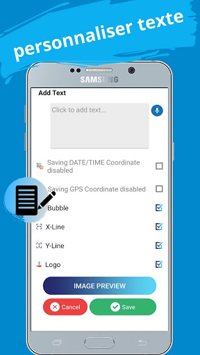Écrivez sur l'image pour faire une documentation complète de la photo. Il suffit de dicter votre texte pour ajouter une légende lorsque vous prenez une photo. Le texte de la photo est automatiquement affiché sur votre image via une traduction de texte à texte.
