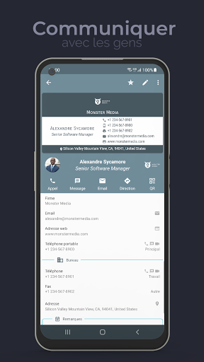 Outil de carte de visite facile à utiliser: recherchez facilement des cartes par nom, société, profession, etc. passez un appel, envoyez un message ou un courrier électronique et prenez direction adresse en un seul clic.
