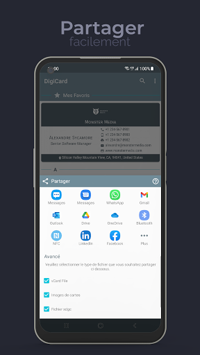 Partager vCard: Lorsque vous partagez votre carte, le fichier vcard est également envoyé. Ainsi, les personnes qui n'utilisent pas DigiCard peuvent enregistrer facilement vos informations de contact.