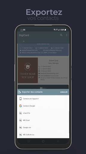 Exporter vers Google Contacts: Vous pouvez exporter vos cartes de visite vers Google Contacts directement.