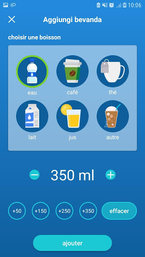 Rappelez-vous que l'eau est contenue également dans d'autres liquides; café, jus, thé ou lait. Notre application vous permet d’ajouter tout type de boisson afin que vous puissiez contrôler votre niveau d’hydratation avec une grande précision.