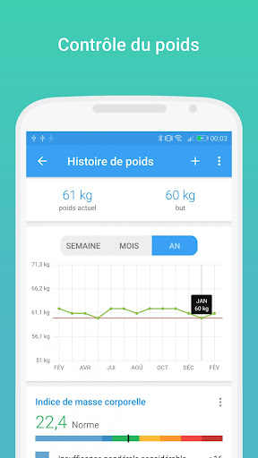 Vous pouvez suiver l’histoire de votre poids et consulter l’indice de masse corporelle. C’est un excellent outil pour perdre du poids.