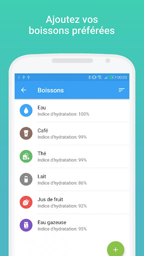 Thé, café, jus, etc. Ajoutez vos boissons préférées et leurs indices d'hydratation pour calculer correctement la saturation en eau du corps.