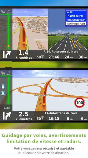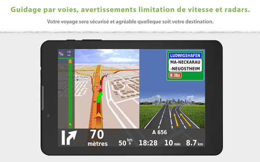 • Guidage sur voie et visualisation des panneaux d´autoroute réels.