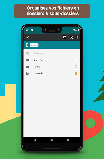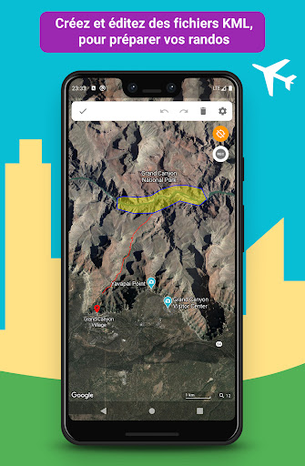 • planifiez vos randonnées en créant des fichiers KML sur la carte. Un fichier KML peut contenir des marqueurs, des lignes et des polygones