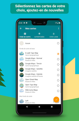 • téléchargez des cartes pour un usage hors-ligne (gratuit pour les cartes OpenStreetMap et Wikimedia Maps, avec abonnement pour E-walk Topo Map ou cartes IGN)