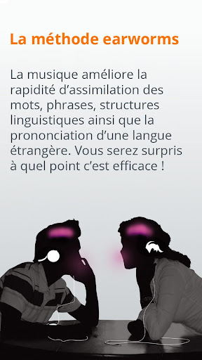 Au lieu d'étudier la langue par des mots individuels et grammaire, la méthode Earworms vous place dans des dialogues avec des expressions de la vie réelle. Elles sont divisées en morceaux, pratiquées avec de la musique, puis reconstruites en phrases complètes. Cela permet à l'étudiant de se rendre compte de la façon dont les cours de langues sont construits et d'étudier facilement le français, l'espagnol, l'allemand, l'italien, l'anglais et d'autres langues.