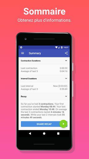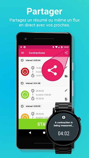Enfin, il est maintenant plus facile que jamais de partager vos contractions. Vous pouvez partager le résumé ou laisser notre application générer un flux en direct que vous pouvez partager avec vos proches.