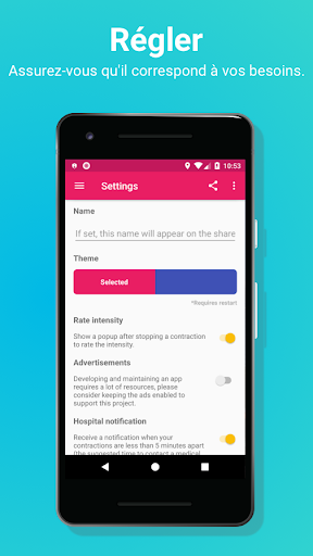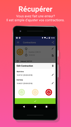 Avec la dernière version de la minuterie de contraction, il est désormais également possible de surveiller l'intensité de vos contractions et d'obtenir un tableau informatif basé sur ces informations. Il est également possible de modifier ou de reprendre une contraction en cliquant sur l'icône en forme de crayon au cas où vous l'auriez accidentellement arrêtée. De plus, la suppression des contractions est aussi simple que de la faire glisser sur l'écran.