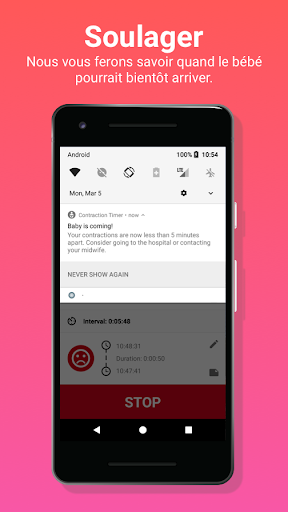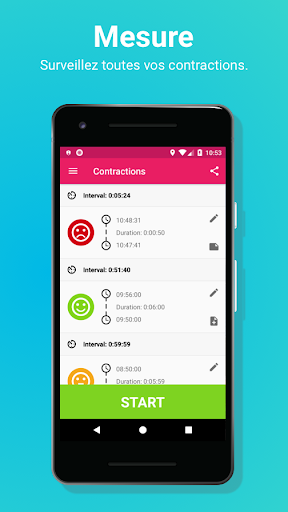 Planifier vos contractions n'a jamais été aussi facile! Appuyez simplement sur le bouton de démarrage lorsque votre contraction commence et arrêtez-vous quand elle s'arrête, c'est aussi simple que cela!