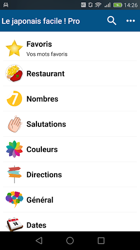 C'est une application très riche qui contient plusieurs centaines de mots de vocabulaires et phrases de tous les jours, répartis en plusieurs catégories :