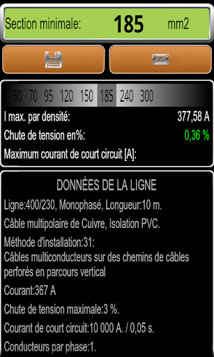 Dans la page de résultats vous pouvez changer de la section calculée, de sorte que vous pouvez voir la courant maximum, la chute de tension et de courant de court circuit maximal pour chaque section sélectionnée.