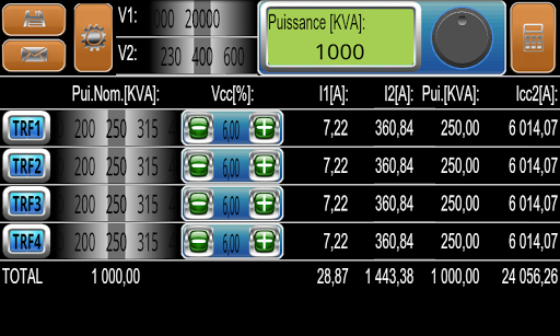 Calcule toutes les valeurs de puissances et de courants circulant par un groupe d'un maximum de quatre transformateurs en parallèle, et peut modifier les valeurs de la demande d'électricité, la puissance nominale, tension nominale et tensions de court-circuit.