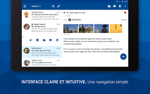 – Une boîte de réception propre et ordonnée avec des avatars de contacts et une option pour activer des fils d'e-mail (toutes les conversations affichées ensemble)
