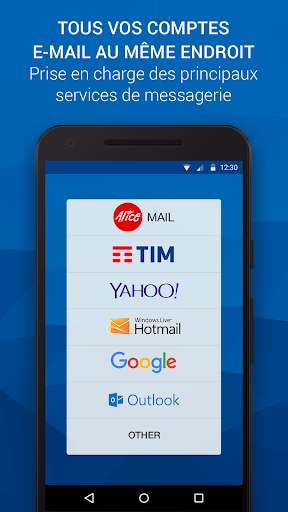 Cette application supporte tous les services e-mail que vous désirez ajouter pour avoir tous vos e-mails au même endroit : TIM Mail, Alice, Hotmail, Outlook, or MSN Mail, Gmail, Yahoo Mail, AOL, GMX, ou n'importe quelle boîte mail POP/ IMAP/ SMTP.