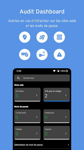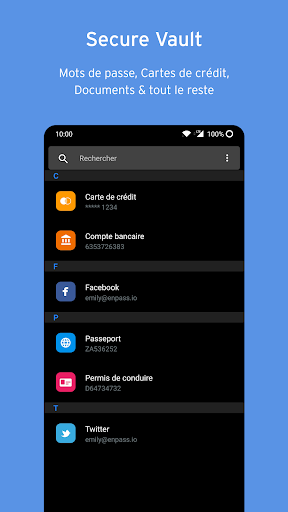 - Peut tout stocker : Coffre sécurisé pour vos identifiants de connexion, cartes de crédit, comptes bancaires, permis de conduire, pièces jointes ou toutes autres types d'informations.