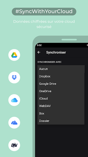 - Choisissez l'endroit où vous sauvegardez vos données personnelles - sur votre (vos) propre(s) appareil(s) et/ou dans votre propre stockage en nuage (iCloud, Google Drive, OneDrive, Box, WebDAV ou Nextcloud).