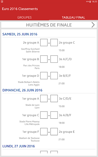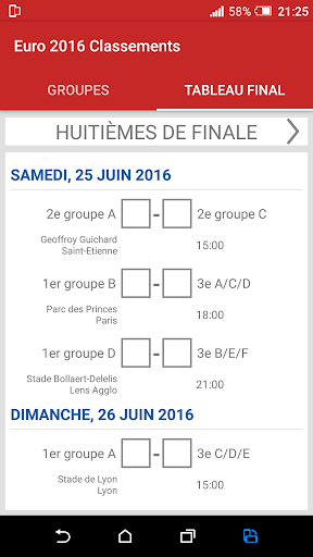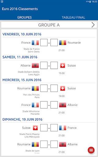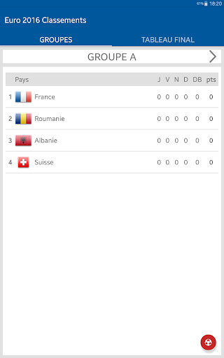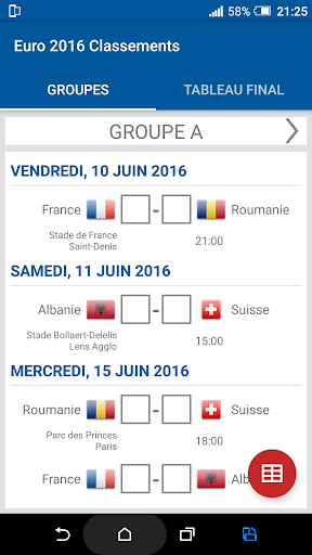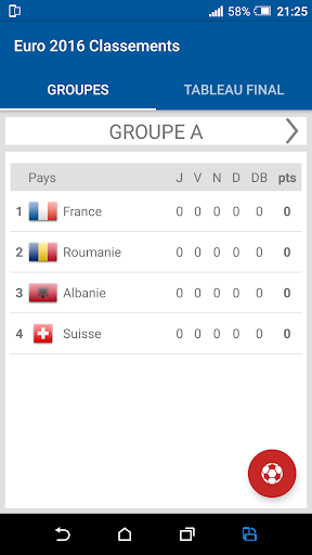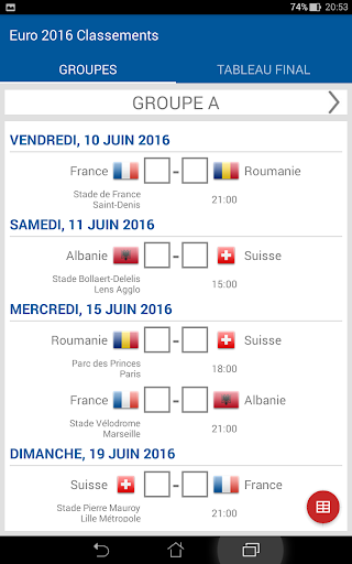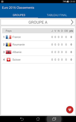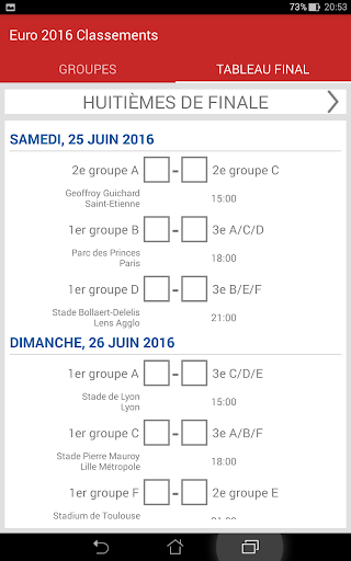 Vous devez uniquement les Résultats de l'entrée, et App s'appuie lui-même toutes les Tables et calcule les Équipes dans les séries Éliminatoires à venir. Aussi dans l'annexe peint l'ensemble du calendrier des matchs. Gardez une trace des Jeux et de remplir votre propre Tableau de l'Euro 2016.