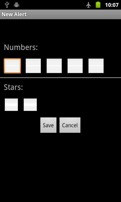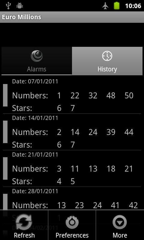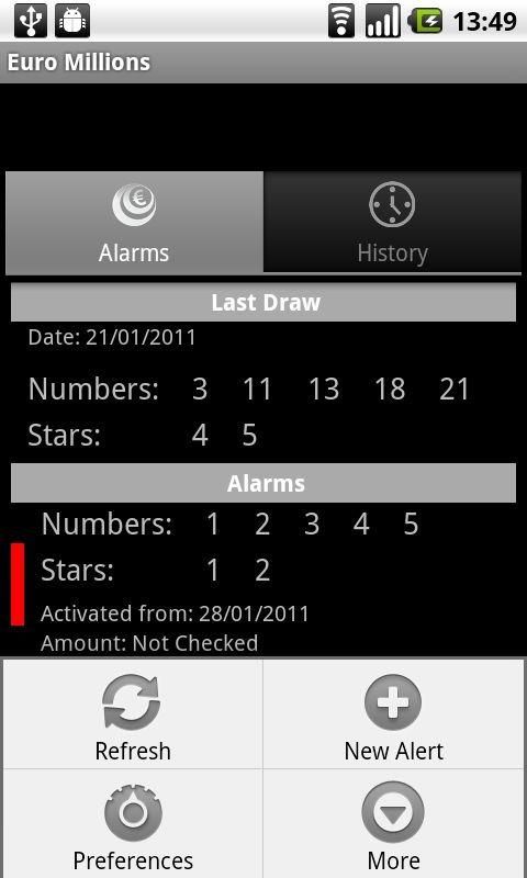 Check your Euro Millions bets now with this application and configure your own alerts. You can activate the alarm to be notified if you won a prize every Friday. CONSIDERATIONS ---------------- * The update of the draws take place every Friday between 22.30 and 00:30 on Saturday so we recommend setting the alarm after this period. * Upon completion of the alarm at the scheduled time only alarm monitoring betting introduced with a date before the drawing. To check the alarm after a draw with the draw, access the alarm with a long press on the alarm to be tested. * The bars to the left of each alarm to indicate more clearly whether the bid is awarded: GREEN -> AWARD RED -> NO PRIZE OR NO CHECK * Due to a bug in Android (Issue 8485) there is an efficient way (without wasting battery) to keep warnings off and on the phone when the application is installed on the SD card. Possible solutions while Google solves this bug are: Possibility 1) Keep the application on the internal memory. The alerts work without having to open the application at any time. Possibility 2) Keep the application on the SD card and open it at any time so the alert will be activated automatically (no need to configure anything, just run the application), which remain active for as long as the device is turned on, Al off the alarm is cleared. * This application is purely informative and in no case allowed to place bets with real validity. This is a beta application as it may contain errors or performance data shown. * This application is purely informative and in no case allowed to place bets with real validity. This is a beta application as it may contain errors or performance data shown. Tags: Euro Millones, Euromillones, Euro Millions, Euro Millionen, Euromillionen, Euro Milhões, Euromilhões