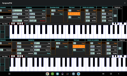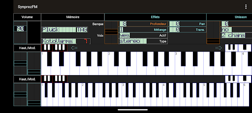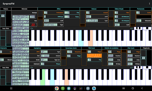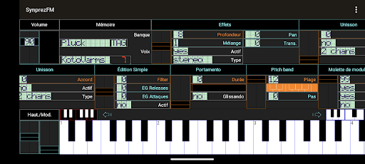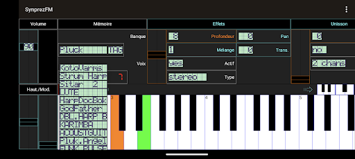 Pendant que vous jouez, vous pouvez déclencher un effet de vibrato 'after-touch' en faisant glisser vos doigts sur les touches actives, et vous pouvez déplacer le clavier pour changer sa tessiture. D'autres paramètres de jeu peuvent être configurés par menu, en particulier 2 types de portamento, des modulations de hauteur ou de volume, et quelques effets stéréos qui donnent une impression de profondeur lorsque vous utilisez un casque, en particulier sur les sons percussifs. Grâce à un cœur optimisé, vous pouvez jouer jusqu'à 16 canaux simultanément, même sur des appareils de milieu de gamme.